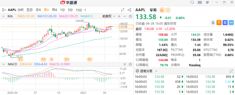 截至发稿,苹果股价在盘后交易中一度上涨大约4%;常规交易时段收于133.58美元。该股今年以来跑输其他大型科技股。