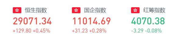 截至收盘,恒生指数涨129.8点或0.45%,报29071.34点,全日成交额达1362.71亿。国企指数涨0.28%,报11014.69点,红筹指数跌0.08%,报4070.38点。