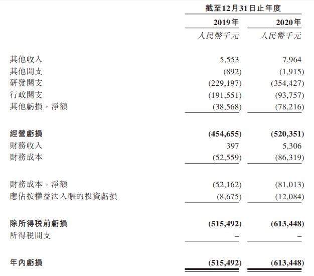 2019和2020年,该公司收入分别为555万元(单位:人民币)和796万元,研发支出分别为2.29亿和3.54亿。2019和2020年亏损分别为5.15亿和6.13亿元。