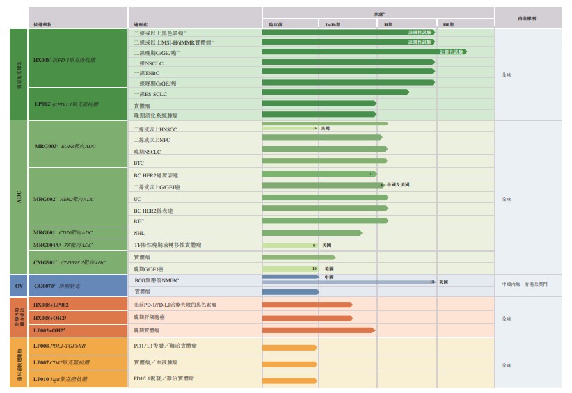 截至最后实际可行日期,乐普的产品管线中有(i)八种临床阶段候选药物(包括四种核心产品及一种乐普透过合营企业共同开发的候选药物);(ii)三种主要临床前候选药物及(iii)三种临床阶段的候选药物的联合疗法。乐普的八种临床阶段候选药物中有五种属于靶向疗法,而三种属于免疫治疗药物,其中两种属于免疫节点药物及一种属于溶瘤病毒药物。截至最后实际可行日期,乐普已启动28项候选药物的临床试验,其中三项临床试验已进入註册性试验,两项临床试验正在美国进行。