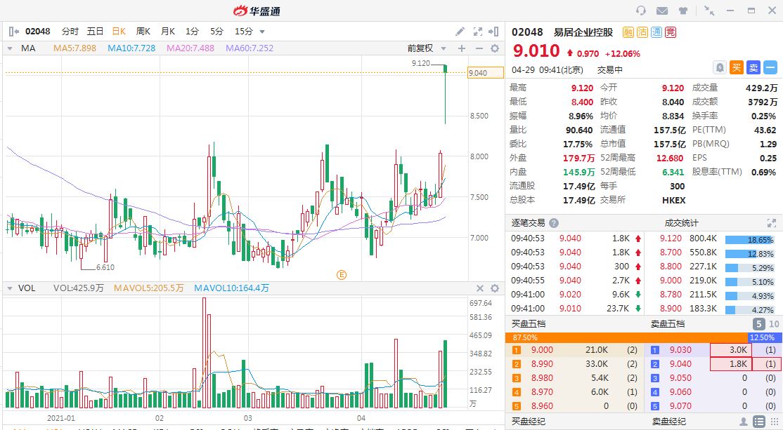 华盛资讯4月29日消息,易居发布公告宣布收购阿里巴巴所持有的天猫好房公司85%股份。同时,阿里巴巴和周忻增持易居股票。交易完成后,天猫好房公司成为易居旗下全资子公司,而阿里将成为易居第二大股东。受此消息提振,易居一度涨超13%。截止发稿,易居企业控股涨超12%,现报每股9.01亿港元,总市值157亿港元。