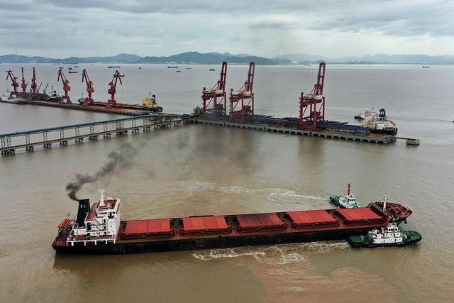 一艘散货船驶离宁波舟山港。中国正在国际市场大量采购大宗商品以加快其工业领域的发展。