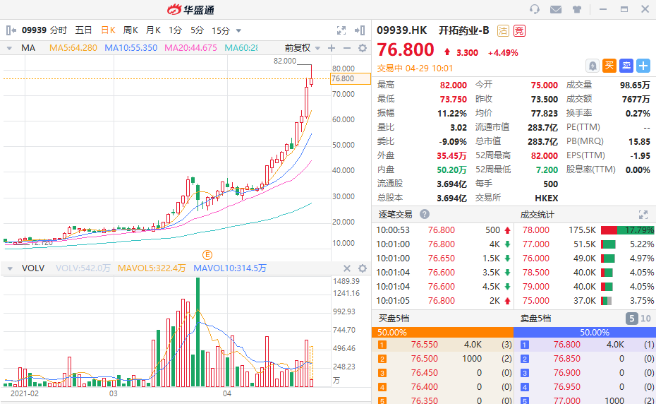 华盛资讯4月29日消息,受印度疫情影响,抗疫概念股开拓药业,近期接连刷新历史新高,三个月累计涨超450%。截至发稿,开拓药业涨4.49%,现报76.8港元每股,最新总市值为283.7亿港元。该股自去年十月末至今,股价翻了近十倍。