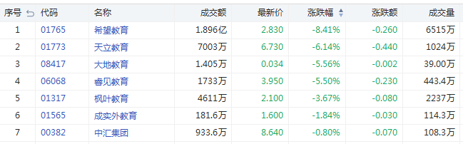 部分教育股逆市走弱,希望教育(01765)跌8.41%,报2.83港元;天立教育(01773)跌6.14%,报6.73港元;枫叶教育(01317)跌3.67%,报2.1港元。