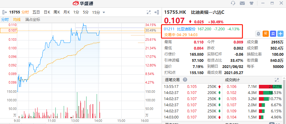 相关窝轮方面,比迪麦银一六沽C大涨30.49%,成交额302.4万港元,其行使价为165.88港元,2021年6月2日到期,溢价7.19%。