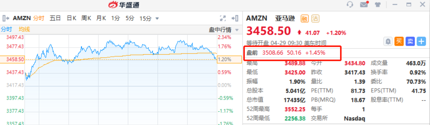 截至发稿,亚马逊盘前涨1.45%,报价3508.66美元。