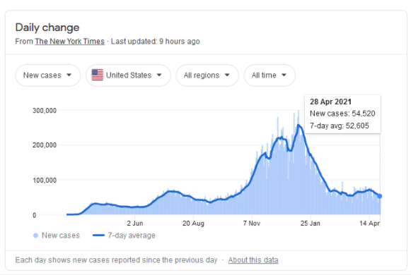 从图表不难看出,随着疫苗接种工作的稳步推行,美国的新冠病例已经出现明显下降。根据媒体的报道显示,美国目前超过一半的州,新冠肺炎病例显著下降,病毒的发展轨迹显著改善,与此同时,住院和死亡人数也都大幅下降。调查显示,截至本周二,美国平均每天新增病例近5.4万,较两周前下降了24%。