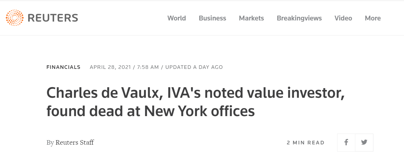 周四,据外媒报道,华尔街传奇价值投资基金经理查尔斯·德·沃克斯(Charles de Vaulx)于当地时间4月26日,从国际价值顾问公司办公室第五街717号的10层跳下自杀身亡,留下了妻子和两个孩子。据悉,2021年3月,他管理的基金宣布清算。导致清算的原因是其价值投资策略(挖出被低估的股票)受到大流行的打击,投资者纷纷大批撤回现金。其管理的资产由于客户赎回而从200亿美元跌至10亿美元以下。