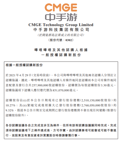 中手游发布公告,公司拟以每股3.3港元(单位下同)向哔哩哔哩、Wide Fortune及Century Network分别发行1.98亿股、5640万股及350万股。相当于扩大股本7.15%、2.04%及0.13%。所得款项净额8.49亿元。于2021年4月29日,公司与哔哩哔哩订立业务合作协议,当中载列公司与哔哩哔哩之间的战略合作主要条款,并将于哔哩哔哩认购协议完成时生效。