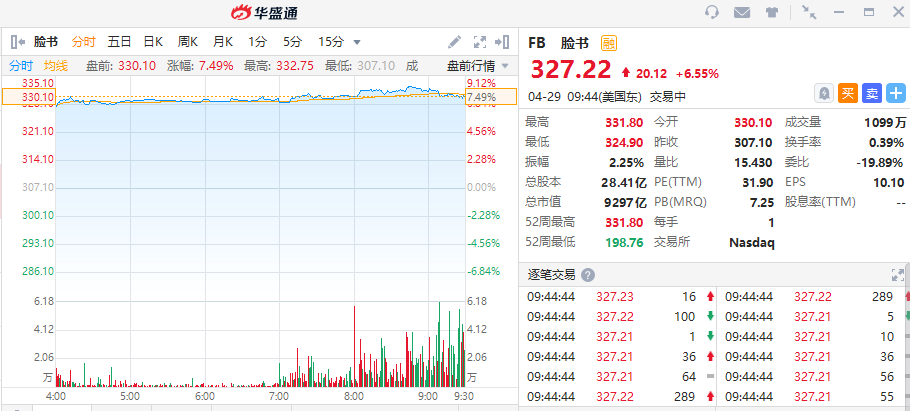 华盛资讯29日消息,美股盘初,Facebook(FB)涨超6%,盘中一度创股价新高,一季度业绩超预期,净利同比增94%,此前获瑞信将目标价从371美元上调至400美元。