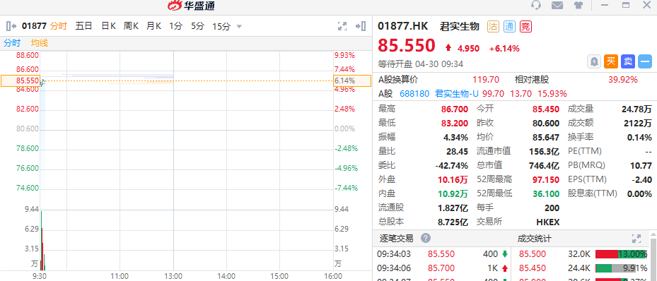 华盛资讯4月30日消息,昨日君实生物公告,2021年第一季度,公司营业收入为16.15亿元,同比增长838.81%;归属于上市公司股东的净利润为3.77亿元,相对上年同期亏损2.29亿元,扭亏为盈。受此消息提振,君实生物开盘涨超6%,现报每股85.55港元,总市值746.4亿港元。