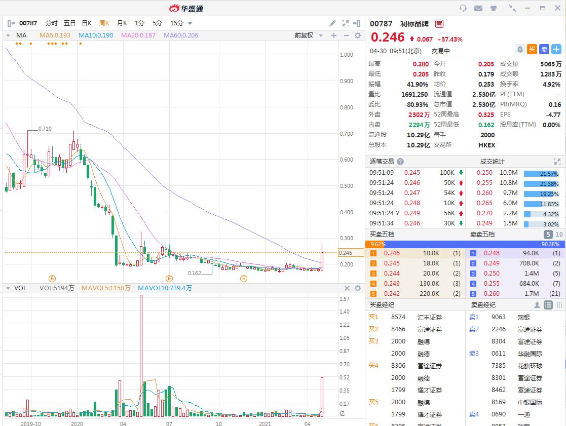 华盛资讯4月30日消息,利标品牌盘中飙升逾37%,现报0.246港元每股,成交额1283万港元,换手率为4.92%。