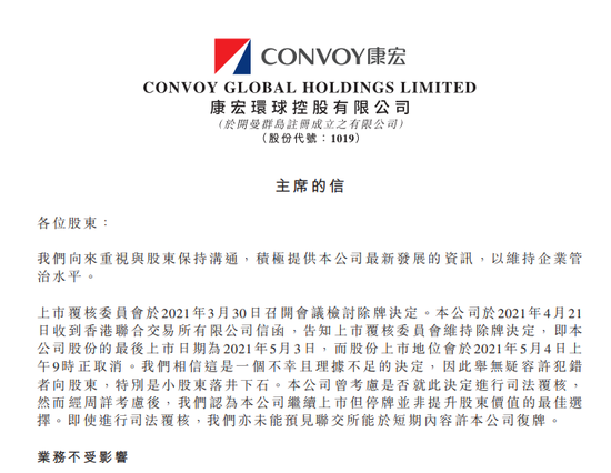 康宏环球(01019.HK)公布,联交所决定取消公司股份的上市地位,自5月4日(下周二)上午9时正起生效。