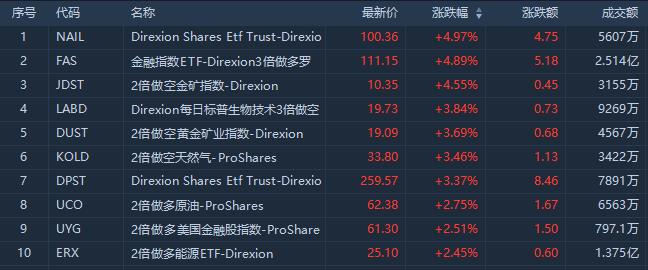 美股上个交易日涨幅前十的ETF