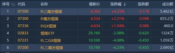 看多恒指相关ETF走弱,南方两倍做多恒科(07226.HK)跌4.6%,成交额约9878万港元。
