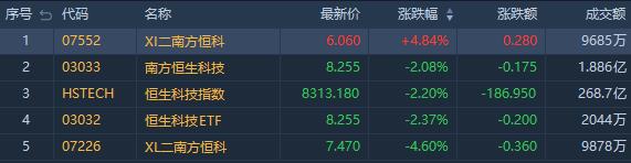 看空恒指相关ETF走强,其中南方两倍做空恒科(07552.HK)涨4.84%,成交额9685万港元。