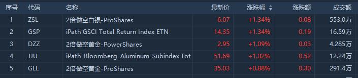 商品ETF涨幅居前的有2倍做空白银的ZSL涨1.34%,成交额553万美元;2倍做空黄金的DZZ涨1.09%。