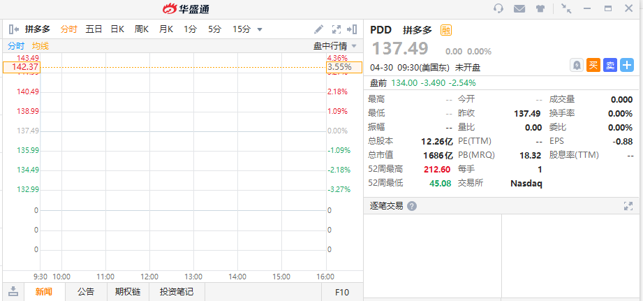 华盛资讯30日消息,美股盘前,拼多多走低,下跌2.54%,股价报134美元。