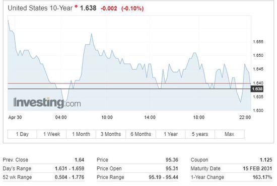 今日讲话后,中长期美债收益率短线走低。10年期基准美债收益率短线下挫逾1个基点,日内整体转跌,暂报1.6312%,逼近美股盘前录得的日低1.6294%。