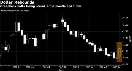 美元创下近两个月最大涨幅,因美国经济反弹速度快于欧洲和亚洲国家,促使交易员在月末回补空头仓位并重新平衡投资组合。