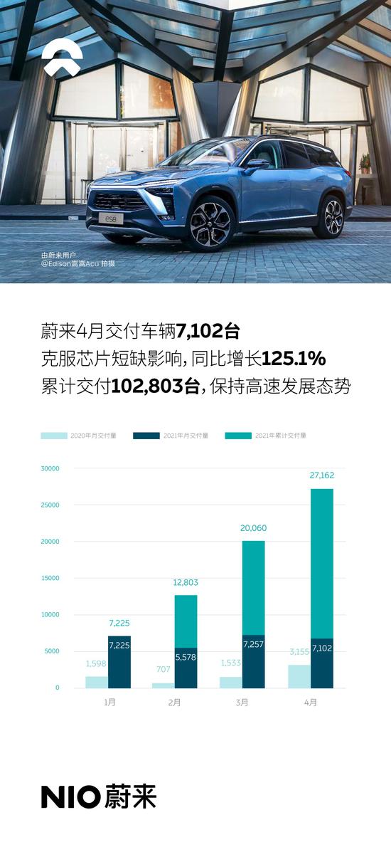 5月1日,蔚来宣布4月交付量达7102台,同比增长125.1%,保持高速发展态势。这是蔚来克服芯片短缺的影响,年内第三次月交付超7000台。截至4月30日,蔚来累计交付量突破10万台,达102803台。预计2021年第二季度交付量为21,000到22,000台。
