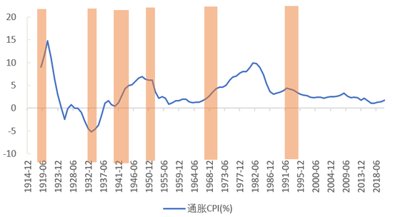 注:从左至右分别对应第一次世界大战、罗斯福新政、第二次世界大战、朝鲜战争、越南战争、《1990年监察预算调节法案》