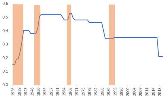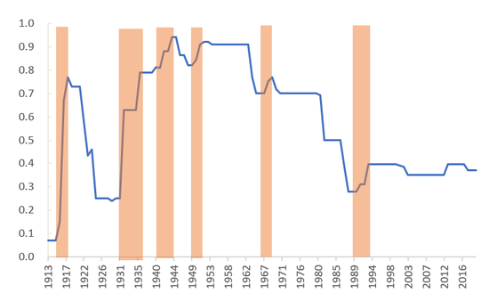 | 注:五次主要的增税时间,从左至右分别是罗斯福新政、第二次世界大战、朝鲜战争附加税、越战附加税、《1990年监察预算调解法案》。依据个人所得税最高边际税率的持续时间划定 |