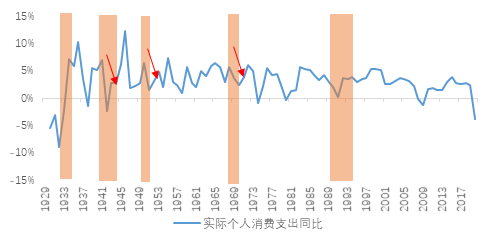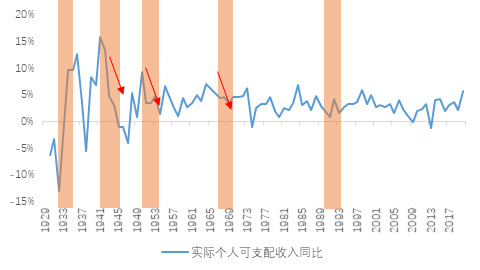 加税所得是否用之于民决定了居民实际可支配收入和消费的变化。战争期间赋税通常会导致个人可支配收入和消费支出的减少,而为基建计划推行而增税时,收入调节和基建的溢出效应往往推升个人可支配收入和消费支出增速。