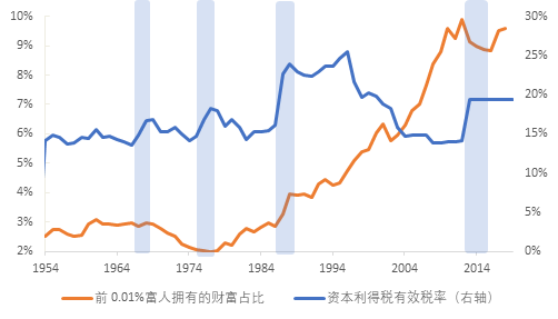 但拉长来看,1980年后前0.01%群体的总财富占比跟随美国股市市值不断膨胀,资本利得税率的提高只是延缓了贫富差距拉大的速度,富人不会因此而永久降低资产的配置,贫富分化也无法得到根本改变。
