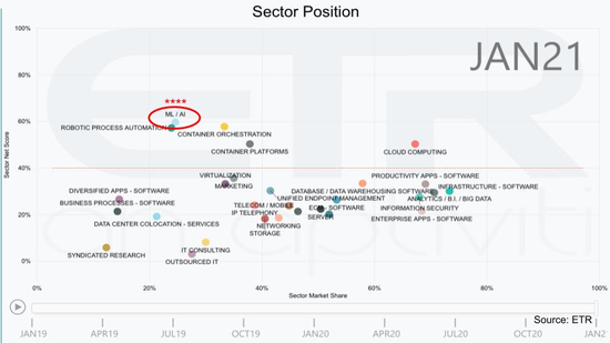 上图显示了 ETR 调研的 1200 多个访问对象的支出数据情况,ML / AI 在纵轴上排在首位,衡量支出速度的指标是净分(Net Score);横轴是市场份额或数据集中的占比,显示调查数据中每个季度的情况。