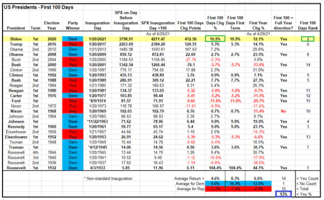 美股传统红四月名副其实,在政府新一轮财政刺激落地及疫苗分发取得进展的提振下,美国家庭消费支出帮助经济逐步走出阴影,投资者信心逐渐升温。截至4月30日拜登上任100天之际,标普500指数累计涨幅10.9%,为1933年罗斯福时期同期最佳表现。历史数据显示,美股年内有望延续涨势,但估值、税改等因素成为了短期扰动市场的重点因素。