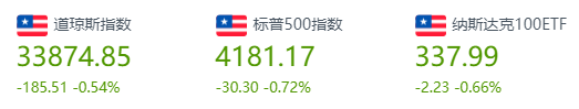 截至收盘,道指跌185.51点或0.54%,报33874.85点;纳指跌119.86点或0.85%,报13962.68点;标普500指数跌30.3点或0.72%,报4181.17点。