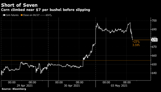 芝加哥市场玉米期货创下八年新高,止于每蒲式耳略低于7美元,后回吐部分涨幅。