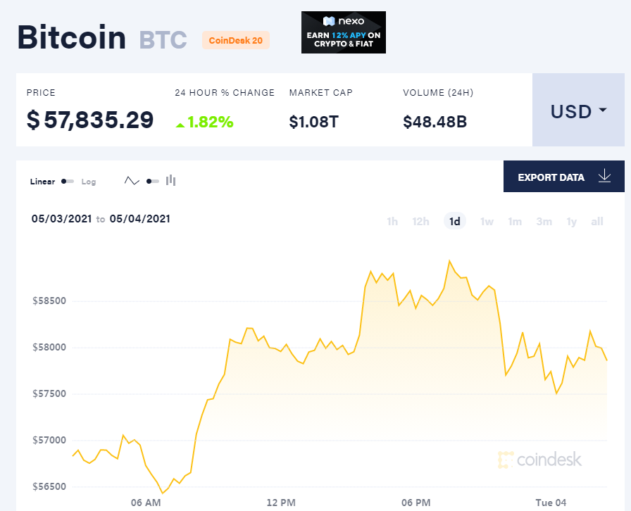 比特币在北京时间昨天清晨曾下探至56500美元下方,随后升至58000美元附近,虽然曾上探至59000美元附近的日内高点,但在美国时段又回落至57500~58000的震荡区间。根据CoinDesk的数据,截至发稿,比特币最新报57835.29美元,24小时上涨1.82%,总市值为1.08万亿美元。