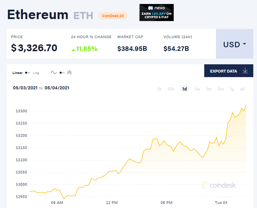 以太币在北京时间昨日清晨探至2950美元下方的低位之后便一路上行,中途突破了3000美元的整数关口,虽然曾在3100~3200美元之间有过震荡,但在昨晚10时许又恢复了上行趋势。根据CoinDesk的数据,截至发稿,以太币最新报3326.70美元,24小时上涨11.85%,总市值为3849.5亿美元。