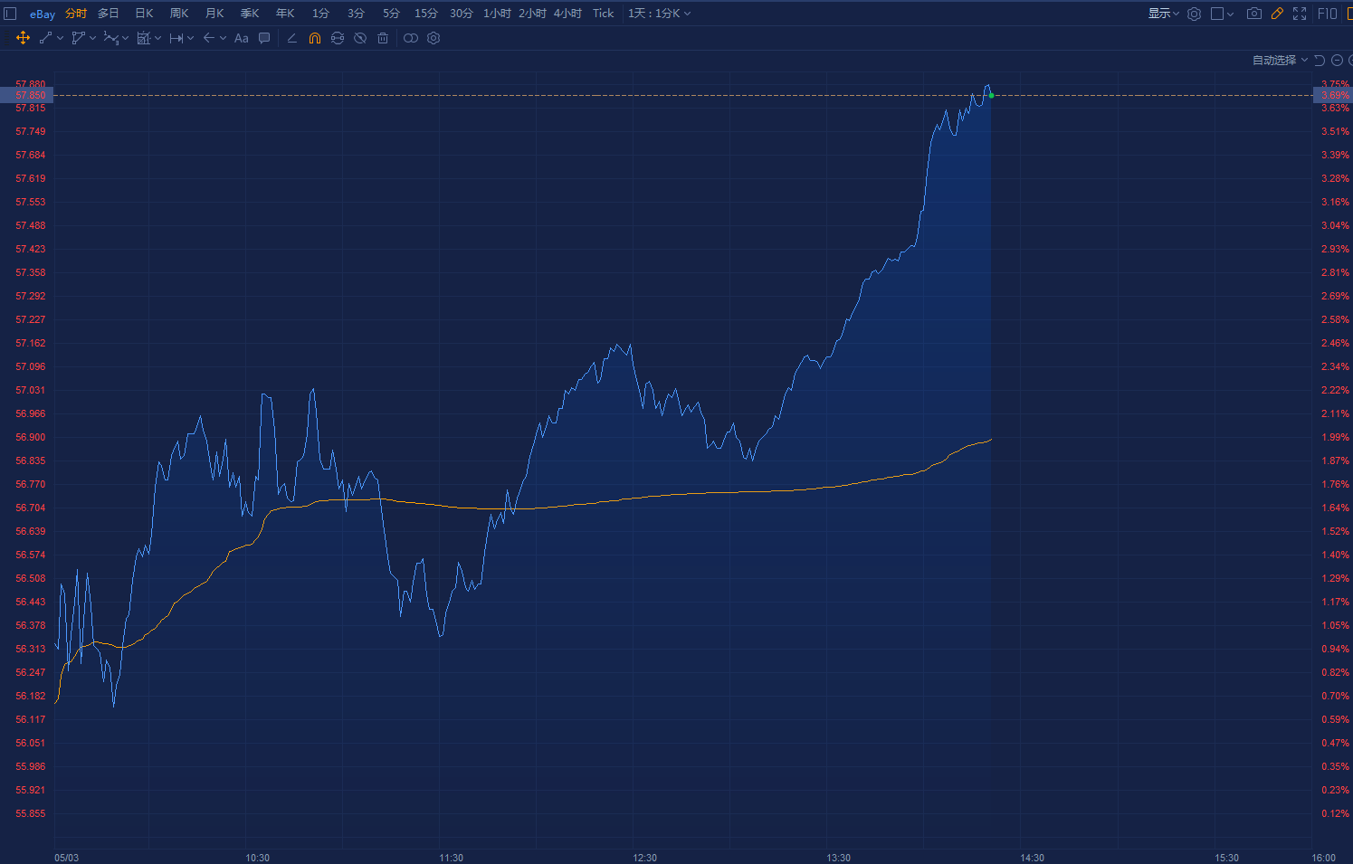 而eBay股价美东时间早间高开之后大体维持震荡走势,中午在受消息刺激后一路走高。截至发稿,eBay股价报57.85美元,涨3.69%。