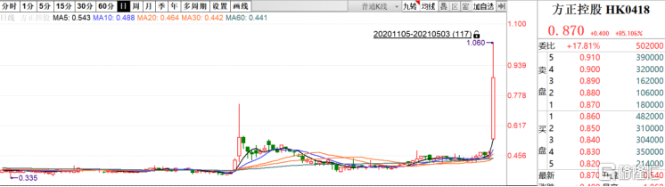 若重整计划草案顺利通过,中国平安将纳入方正旗下医疗健康资源,完善医疗生态圈版图,推动金融保险主业转型升级。中国证券业有可能迎来一颗新星。受此利好消息影响,港股方正控股今日盘中一度涨超120%,收涨85.1%,报0.87港元,最新总市值10.44亿港元。