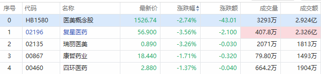 5月4日消息,昨日强势的医美概念股今日转跌,复星医药跌3.56%,瑞丽医美跌3.26%,一度跌近9%,四环医药跌超1%。