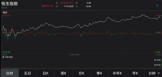 5月4日港股三大指数均收涨,午后涨幅明显扩大。多家投行上调香港今年经济增长预测,给予市场信心。截至收盘,恒指涨0.7%报28557点,国指涨0.49%报10765点,恒生科技指数涨0.68%报8284点。