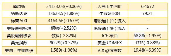 1、隔夜美股截至收盘,道指涨19.80点或0.06%,报34133.03点;纳指跌261.61点或1.88%,报13633.5点;标普500指数跌28点或0.67%,报4164.66点。港股ADR指数下挫,按比例计算,收报28287点,跌270.43点或0.96%。