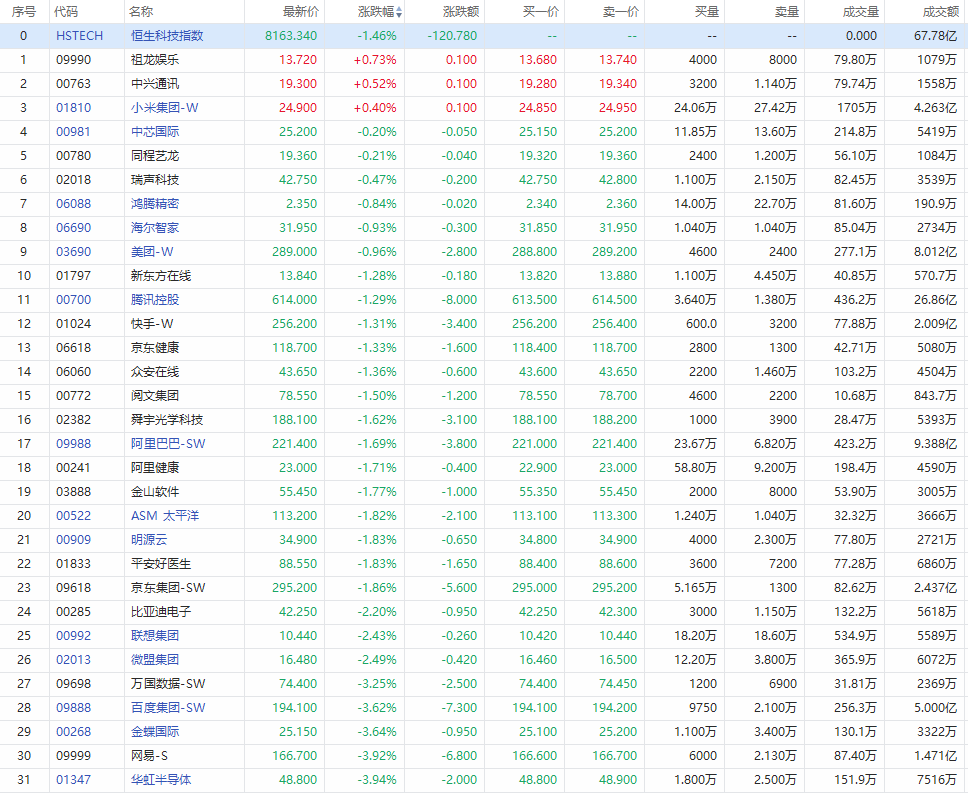 隔夜美股因耶伦意外谈及加息下跌,带动今早港股市场科技股普跌。大市值科技股中,腾讯跌1.29%,阿里巴巴跌1.69%,美团跌0.96%,快手和京东集团跌超1%。百度跌超3%创新低。