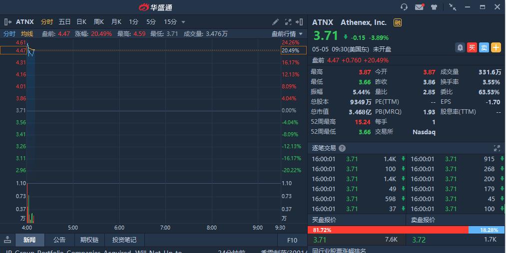 华盛资讯5月5日讯,美股盘前,生物制药公司Athenex(ATNX)盘前一度涨超20%,公司将以1.85亿美元收购Kuur医疗公司。