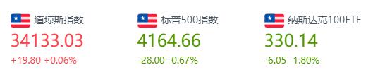 截至收盘,道指涨19.80点,或0.06%,报34133.03点;纳指跌261.61点,或1.88%,报13633.50点;标普500指数跌28.00点,或0.67%,报4164.66点。