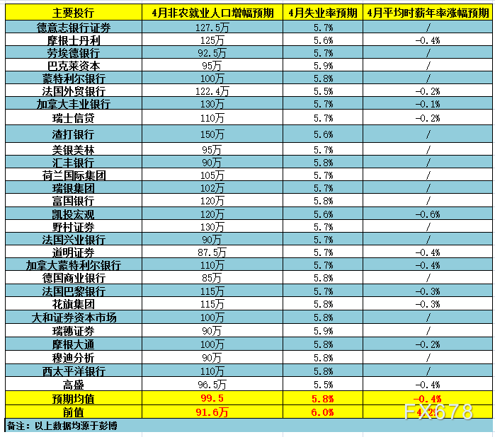 28家大型投行预测显示,主要投行对4月非农就业人口的增幅预期较为乐观,但各投行之间的预期差距较大,值得注意的是,此次平均时薪的预期均为负值,具体而言,