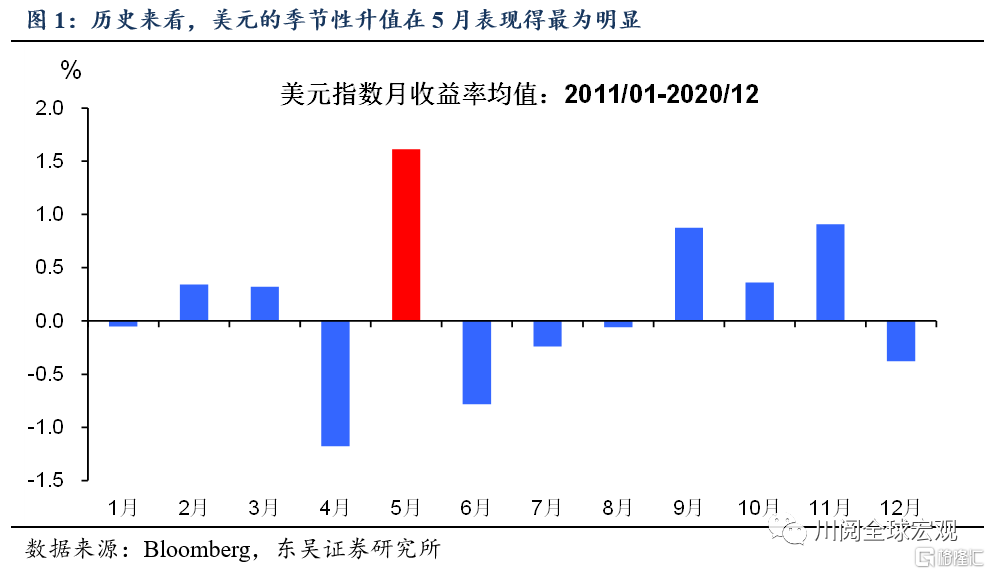 对市场而言,尽管全球股市很可能因上述鹰派言论以及“Sell in May”出现回调,但同样不可忽视的是美元的升值风险,如图1所示,美元指数往往在5月季节性走强,这对于全球的资金流动和资产配置都将产生一定的影响。