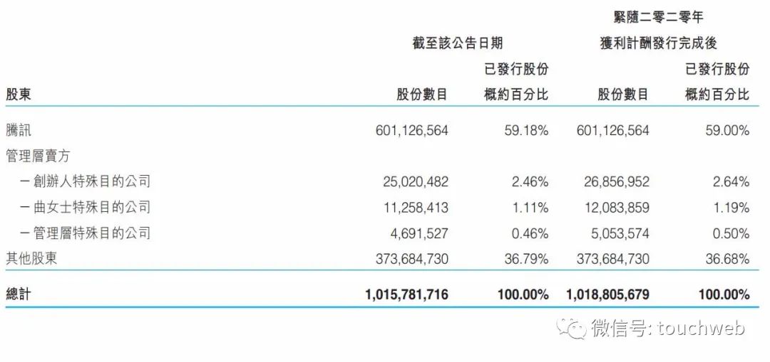 截至2020年12月31日,腾讯持股为59%,创始人特殊目的公司持股为2.64%,曲女士特殊目的公司持股为1.19%。