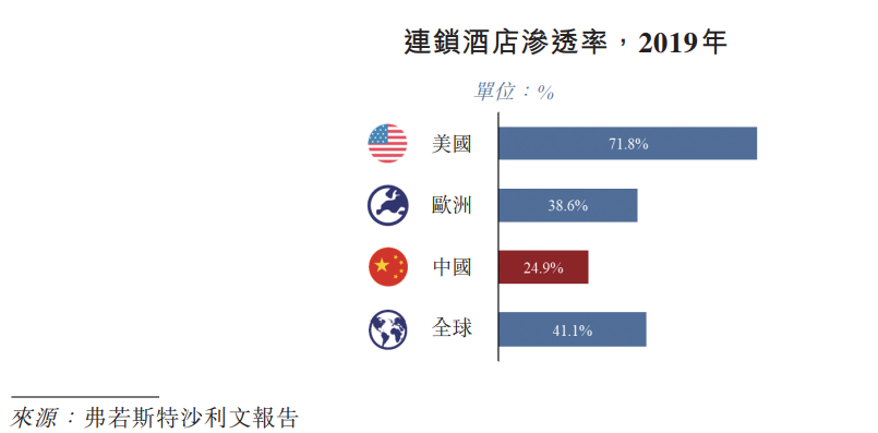 目前来说与国际相比,中国连锁酒店渗透率低,行业市场空间还很大。根据弗若斯特沙利文报告,2019年,中国连锁酒店渗透率(客房数占酒店客房总数)为 24.9% ,低于全球平均水平约41.1%,更别说美国的71.8%。