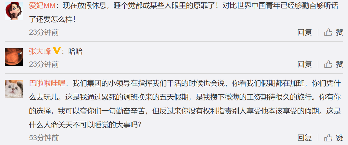 “ 青年们被你们996整的太缺觉了”,“没事睡个懒觉还不行了?假期不是用来休息的吗?别把自己整太累了,休息也很重要。”