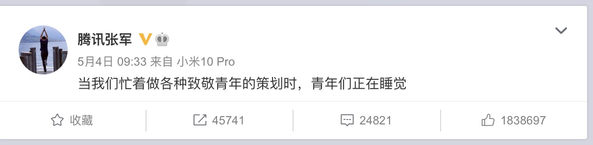 5月4日,腾讯公关总监张军个人微博发布消息称:“当我们忙着做各种致敬青年的策划时,青年们正在睡觉。”