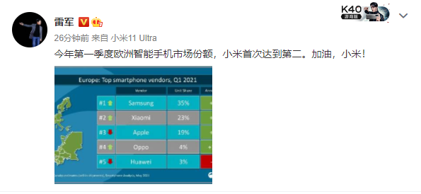 今早小米集团董事长兼CEO雷军在微博表示,今年第一季度欧洲智能手机市场份额,小米首次达到第二。